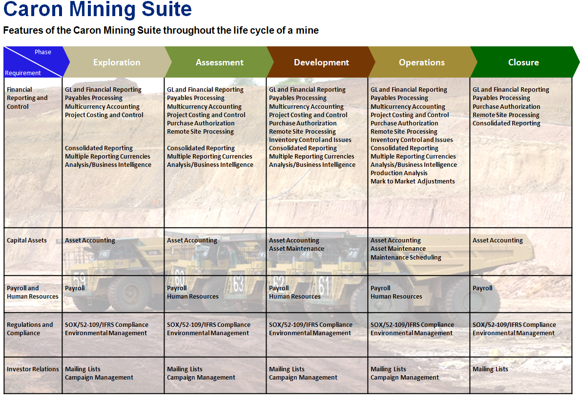 We focus on business management software for mining companies. During each phase of the mining life cycle, mining companies have certain requirements that can be addressed by business management software. The requirements differ by phase. I’ve looked at five general requirements in each phase of the mining life cycle; financial reporting and control, capital asset tracking, payroll and human resources management, regulations and compliance and investor relations.